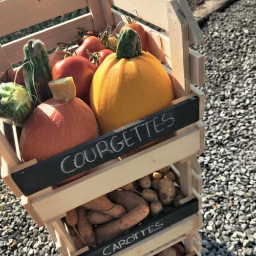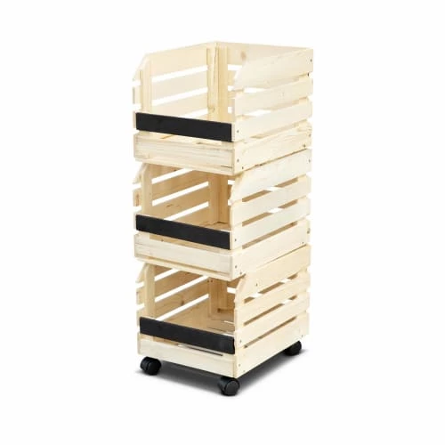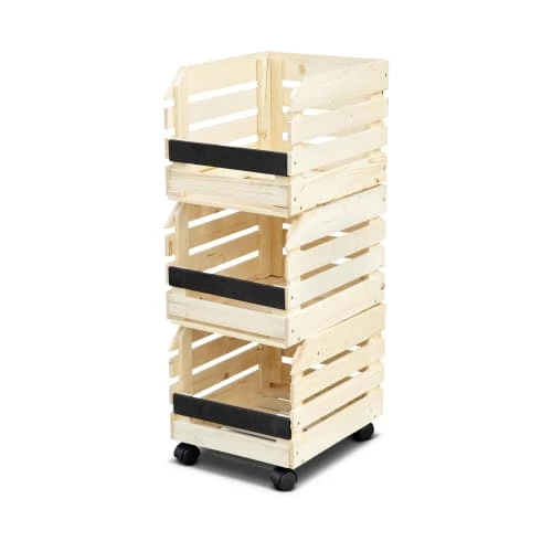 Rangement idéal pour vos légumes, ce lot de 3 cagettes en pin est empilable et l’une des cagettes est à roulettes, pour les bouger facilement une fois empilées. Bien-sûr, vous pouvez également utiliser ces clayettes bois de manière séparée. En avoir plusieurs à la fois vous permettra de séparer vos différents légumes et de mieux organiser votre rangement. De plus, chaque cagette a une ardoise pour indiquer son contenu sans avoir à regarder. Afin de favoriser la circulation de l’air ainsi que la conservation de vos légumes, toutes les cagettes sont ajourées.