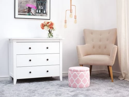 Ottoman multifonction en forme cylindrique. Cet Ottoman original en forme cylindrique mesure 35x35x30 cm. Il est multiusage, il peut aussi bien servir de tabouret que de repose-pieds et surtout permet de stocker n’importe quel objet. L’assiseest très moelleuse et confortable, il sera l’élément idéal dans votre salon, dans votre coin lecture ou bien dans votre chambre. Il possède également des petits pieds discrets d’une hauteur de 3 mm, afin de vous assurez une assise stable. En outre de son côté pratique, il ajoutera un atout décoratif non négligeable avec son design et ses motifs roses au contour blanc. Dites stop aux désordres ! N’entassez plus vos affaires et stocker absolument tout dans ce coffre !Détails: Type de produit: Pouf Style: Moderne Couleur principale: Rose Type de matière: Tissu Matière principale: Coton Matière secondaire: Matière synthétique Composition de la matière: 100% Coton Forme: Rond Motif: Treillis Rangement: Oui Dimensions: Profondeur: 35 cm Largeur: 35 cm Hauteur: 30 cm Poids: 3 kg Charge admise: 130 kg L`offre inclue: 1 x Ottoman Caractéristiques clés: Rangement facile d’accès pour les enfants, Style rétro, Espace de rangement fonctionnel, Entièrement rembourré sur tous les côtés, Multifonctionnel Informations d`assemblage: Ne nécessite pas d’assemblage Conseils de maintenance: Coton: 1. Aspirez en utilisant l’embout approprié 2. Nettoyez avec un shampooing sec ou une éponge humide et un nettoyant doux.