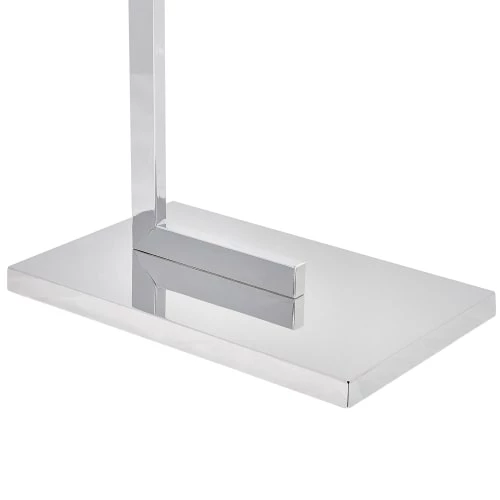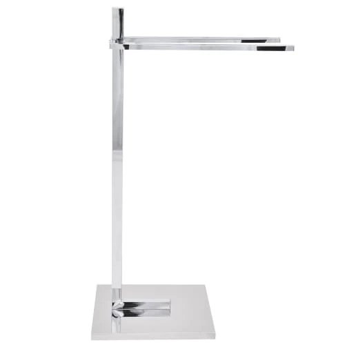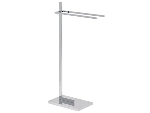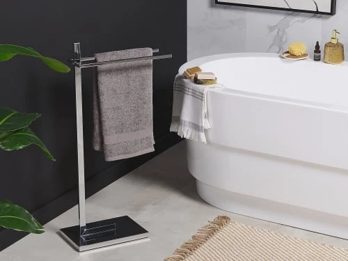 Porte-serviettes design sur pied avec 2 barres en acier argenté finition chromée. Vous souhaitez avoir vos serviettes toujours à portée de main, mais souhaitez éviter les perçages inutiles dans votre salle de bain ? Si c’est le cas, alors ce porte-serviettes sur pied design est fait pour vous ! Les deux barres chromées à la même hauteur garantissent une bonne circulation de l’air et un séchage rapide de votre linge de bain. La base rectangulaire du support offre à ce porte-serviettes beaucoup de stabilité et une excellente tenue et peut facilement être placée n’importe où – que ce soit près du lavabo, de la baignoire ou de la douche. Détails: Type de produit: Porte-serviettes Style: Moderne Couleur principale: Argenté Type de matière: Acier Matière principale: Acier Finition: Chromé Nombre de barres: 2 Dimensions: Dimensions de la base: 32×20 Profondeur: 20 cm Largeur: 45 cm Hauteur: 86 cm Poids: 3 kg Charge admise: 2 kg L`offre inclue: 1 x Support serviette Caractéristiques clés: Peut être utilisé avec des serviettes de différentes tailles, Design moderne, Matières robustes faciles à entretenir, De haute qualité, Structure stable et durable Informations d`assemblage: Préassemblé. 5 – 15 min Conseils de maintenance: Acier: 1. Nettoyez avec un chiffon et un détergent doux, essuyez bien ensuite 2.Pour les éléments en cuivre ou chromés, utilisez un produit de polissage spécial 3.Pour éviter les rayures, n’utilisez pas de nettoyants abrasifs.