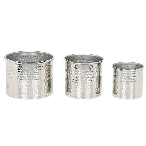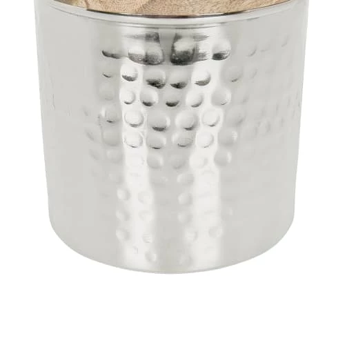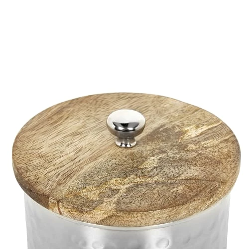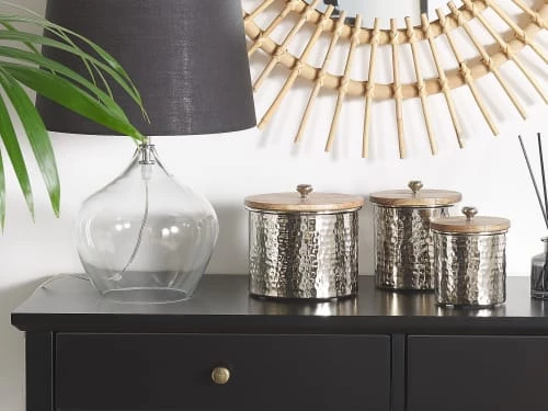 Lot de 3 boîtes déco en aluminium argenté avec couvecles en bois. Cet ensemble pratique et décoratif de trois boîtes est parfait pour ranger tous vos petits accessoires de beauté, vos articles d’hygiène et beaucoup plus encore. Fabriquées en aluminium durable et léger, ces jolies boîtes s’intégreront parfaitement aux intérieurs industriels et minimalistes, grâce à leur finition métallique argentée. Ces récipients déco sont livrés avec leur couvercles en bois qui introduisent un accent naturel et confèrent un look très charmant à chaque pièce dans laquelle ils se trouvent.Détails: Type de produit: Petite armoire de bain Style: Moderne Couleur principale: Argenté Type de matière: Métal Matière principale: Aluminium Matière secondaire: Bois Forme: Rond Finition: Peint Fabriqué à la main: Oui Dimensions: Profondeur: 17 cm Largeur: 17 cm Hauteur: 16 cm Poids: 1 kg L`offre inclue: 3 x Conteneur Caractéristiques clés: Fabriqué à la main avec le plus grand soin, Décoratif et fonctionnel, En harmonie avec n’importe quel type de décoration, Parfait pour un intérieur industriel, Matières de haute qualité Informations d`assemblage: Ne nécessite pas d’assemblage Informations supplémentaires: Veuillez noter que ce produit est un accessoire décoratif et n’est pas destiné à entrer en contact avec les aliments. Conseils de maintenance: Aluminium: 1.Pour éviter les rayures, n’utilisez pas de nettoyants abrasifs 2. Nettoyez avec un chiffon et un détergent doux, essuyez bien ensuite 3.Pour les éléments en cuivre ou chromés, utilisez un produit de polissage spécial. Bois: 1.Essuyez immédiatement après le nettoyage pour empêcher l’eau de s’accumuler sur les meubles 2.Nettoyez avec un chiffon et un nettoyant doux dans le sens du grain du bois 3.De temps en temps, il est conseillé de mettre une nouvelle couche d’huile sur les meubles avec une finition huilée.