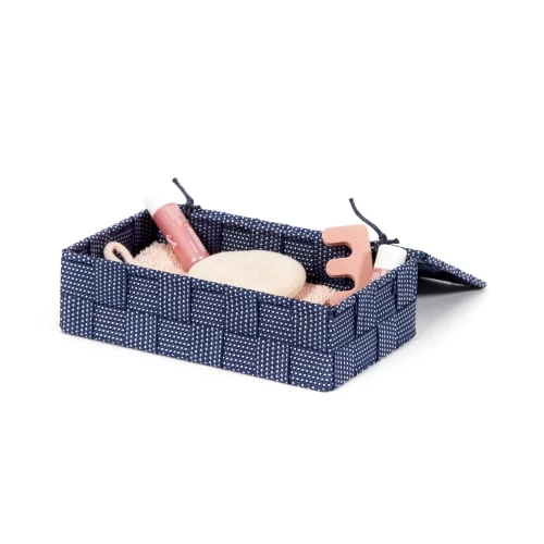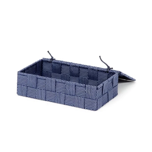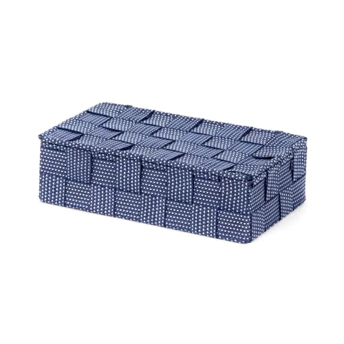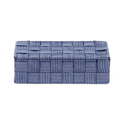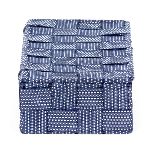 Sangles tressées, armature métallique – Coloris : Marine – Forme rectangulaire – Dimensions : 21 X 12 X H.5,5 cm – Cette boîte en sangles tressées, munie d’un couvercle, est bien utile pour ranger les produits de beauté et le maquillage dans la salle de bain ainsi que les bijoux ou les accessoires de coiffure par exemple. Elle vous servira aussi à ranger les clés dans l’entrée et toutes ces petites bricoles qui encombrent le bureau : stylos, gommes ou agrafeuse. Réalisée en sangles finement mouchetées, elle est consolidée par une armature métallique. Parfaitement assortie aux autres paniers et boîtes Toronto bleu marine, elle vous permettra de composer un rangement harmonieux et vraiment pratique. Les boîtes et les paniers… C’est la plus jolie façon de ranger ! Naturels ou colorés, ils apportent la touche de fantaisie qui fait twister la déco. Que ce soit dans vos placards ou sur les étagères, nous vous recommandons de multiplier les boîtes et paniers identiques : l’effet visuel et l’impression d’organisation seront décuplés. Vous pouvez aussi juxtaposer plusieurs boîtes et paniers de la même teinte ou de la même texture et les coordonner à l’ambiance générale de la pièce que vous rangez. L’harmonie des couleurs participe aussi au sentiment d’ordre et de sérénité.