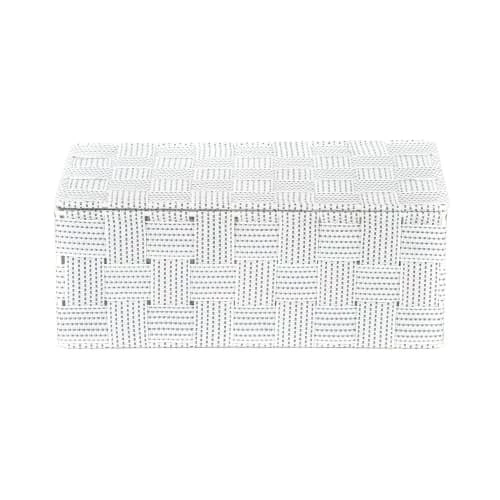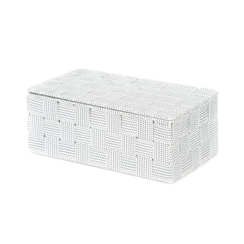 Sangles tressées, armature métallique Coloris : Blanc/gris Forme rectangulaire Dimensions : 27 X 15 X H.11 cm Cette boîte en sangles tressées, munie d’un couvercle, vous permettra de ranger produits de beauté et maquillage dans la salle de bain ainsi que vos bijoux ou votre lingerie et vos accessoires dans le dressing. Elle vous servira aussi à ranger les gants et foulards dans l’entrée et toutes ces petites bricoles qui encombrent le bureau : câbles, écouteurs, ampoules de rechange bien regroupés seront ainsi plus faciles à retrouver. Réalisée en sangles finement mouchetées, cette boîte est consolidée par une armature métallique. Assortie aux autres paniers et boîtes Toronto, elle vous permettra de composer un rangement harmonieux et vraiment pratique. Les boîtes et les paniers… C’est la plus jolie façon de ranger ! Naturels ou colorés, ils apportent la touche de fantaisie qui fait twister la déco. Que ce soit dans vos placards ou sur les étagères, nous vous recommandons de multiplier les boîtes et paniers identiques : l’effet visuel et l’impression d’organisation seront décuplés. Vous pouvez aussi juxtaposer plusieurs boîtes et paniers de la même teinte ou de la même texture et les coordonner à l’ambiance générale de la pièce que vous rangez. L’harmonie des couleurs participe aussi au sentiment d’ordre et de sérénité. LIVRAISON GRATUITE à partir de 60€