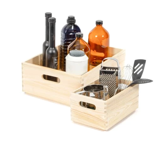 Boîte de rangement en bois avec poignées en pin brut, idéale pour peindre et décorer Adaptez-vous à n’importe quel décor ou créez des boîtes de rangement personnalisées pour les chambres d’enfants, les occasions spéciales ou les cadeaux Disponible en petit, moyen, grand et très grand, parfait pour ranger des livres, des jouets, des CD/DVD, des magazines et d’autres articles dans la maison Fabriqué à partir de pin non fini solide et durable avec 2 poignées de transport Contenu : 1 x petite boîte de rangement en bois avec poignées, (LxPxH) 30 x 20 x 14 cm, marron naturel Réalisées en Pologne, ces boîtes en pin sont le rangement naturel par excellence. Elles sont à la fois bien solides et très faciles à manipuler grâce à leurs poignées arrondies. Leur belle couleur claire se fond dans le décor ce qui les rend idéales pour organiser chaque pièce de la maison : ustensiles et provisions dans la cuisine, livres et magazines sur les étagères du salon… Profitez de la vente par lot : ces 2 boîtes ont des formats complémentaires et sont empilables ce qui vous aidera à agencer des rangements harmonieux et vraiment pratiques. Dimensions : 40 X 30 X H.14 cm et 30 X 20 X H.14 cm. Les boîtes et les paniers… C’est la plus jolie façon de ranger ! Naturels ou colorés, ils apportent la touche de fantaisie qui fait twister la déco. Que ce soit dans vos placards ou sur les étagères, nous vous recommandons de multiplier les boîtes et paniers identiques : l’effet visuel et l’impression d’organisation seront décuplés. Vous pouvez aussi juxtaposer plusieurs paniers et boîtes de la même teinte ou de la même texture et les coordonner à l’ambiance générale de la pièce que vous rangez. Parce que l’harmonie des couleurs participe aussi au sentiment d’ordre et de sérénité. Une maison accueillante où il fait bon vivre, LIVRAISON GRATUITE à partir de 60€