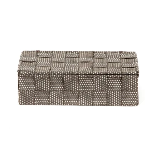 Sangles tressées, armature métallique – Coloris : Marron – Forme rectangulaire – Dimensions : 21 X 12 X H.5,5 cm – Cette boîte en sangles tressées, munie d’un couvercle, est bien utile pour ranger les produits de beauté et le maquillage dans la salle de bain ainsi que les bijoux ou les accessoires de coiffure par exemple. Elle vous servira aussi à ranger les clés dans l’entrée et toutes ces petites bricoles qui encombrent le bureau : stylos, gommes ou agrafeuse. Réalisée en sangles finement mouchetées, elle est consolidée par une armature métallique. Assortie aux autres paniers et boîtes Toronto, elle vous permettra de composer un rangement harmonieux et vraiment pratique. Les boîtes et les paniers… C’est la plus jolie façon de ranger ! Naturels ou colorés, ils apportent la touche de fantaisie qui fait twister la déco. Que ce soit dans vos placards ou sur les étagères, nous vous recommandons de multiplier les boîtes et paniers identiques : l’effet visuel et l’impression d’organisation seront décuplés. Vous pouvez aussi juxtaposer plusieurs boîtes et paniers de la même teinte ou de la même texture et les coordonner à l’ambiance générale de la pièce que vous rangez. L’harmonie des couleurs participe aussi au sentiment d’ordre et de sérénité.