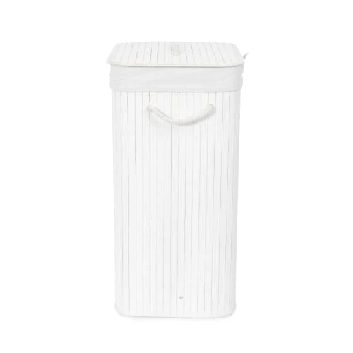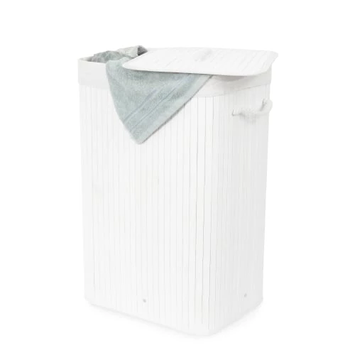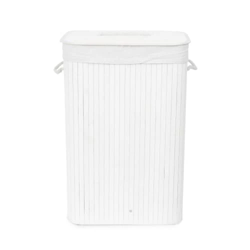 Ce panier à linge en bambou de couleur blanche est idéal pour ajouter une touche déco naturelle à votre salle de bain ou votre buanderie. Ce panier à linge rectangulaire offre un volume important appréciable, tout en occupant un espace réduit. Ce panier à linge se compose d’une housse amovible en tissu écru, lavable en machine, facilitant l’entretien du panier à linge. Le couvercle permet d’éviter que la poussière ne se dépose sur le linge. Le panier est confectionné à la main à partir de lattes de bambou, ce qui confère aux paniers une touche naturelle unique. De légères variations de couleur et de forme peuvent apparaître d’un modèle à l’autre. Le panier à linge est livré à plat pour faciliter le transport, le montage est rapide et facile. Dimensions : 45 x 35 x H. 60 cm. LIVRAISON GRATUITE à partir de 60€