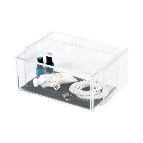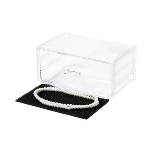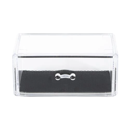 Rangement transparent pour bijoux et maquillage 1 tiroir pour tout organiser Cette boîte transparentepermet de ranger librementbijoux, produitscosmétiques ou accessoires de coiffuretout en les protégeant de la poussière. Dans votre chambre ou dans la salle de bain, plus besoin de chercher au fond des tiroirs, vos bijoux et produits de beauté préférés seront bien visibles etfacilement accessibles. Cette boîterange-bijoux est équipée d’untiroir coulissant garni d’un tissu noir amoviblequi amortit les chocs et protège ce que vous y rangez. Rien ne vous empêche d’ailleurs d’utiliser cette boîte transparente pour ranger vosfournitures de bureau ou petits ustensiles dans la cuisine.Dimensions 23,8 X 15,3 X H.10,8 cm. Si vous aimez le maquillage et les bijoux, pourquoi ne pas vous aménager un espace beauté rien que pour vous ? Sur une étagère, une commode ou une console, dans une pièce bien éclairée,disposez plusieurs rangements transparents dans différents formats adaptés à ce que vous voulez ranger. Ce n’est pas le choix des organisateurs de beautéqui manque chez Compactor ! Regroupez-là tous vos accessoires. Bijoux bien sûr mais aussi poudre, fond de teint, rouges à lèvres, mascaraset tout le nécessaire pour les appliquer : les cotons à démaquiller,les brosses, les crayons,lespinceaux, le recourbe-cils… Bref, tout ce qu’il faut pour une petite retouche ou une vraie mise enbeauté ! Une maison accueillante où il fait bon vivre, c’est aussi celle qu’on aura mis tout son cœur à organiser.Avec des rangements adaptés, simples à installer et facilement accessibles, Compactor vous aide à faire la chasse au désordre pour vous éviter dustress tout envous aidantàlibérer du temps pour vous.Et c’est fou comme, tout à coup, la maison bien ordonnéepeut sembler belle et facile à vivre! LIVRAISON GRATUITE à partir de 60€