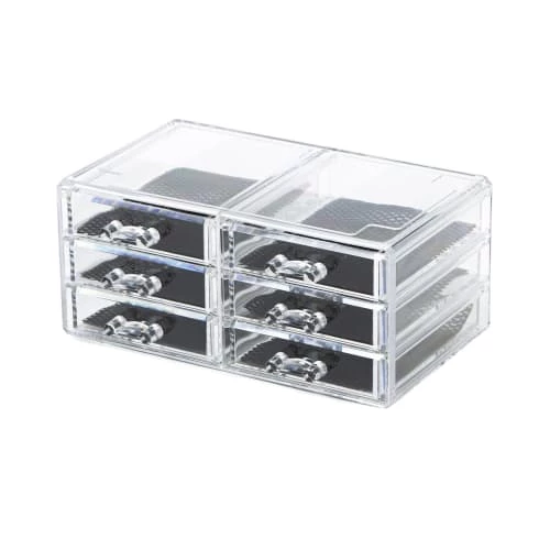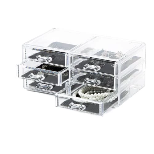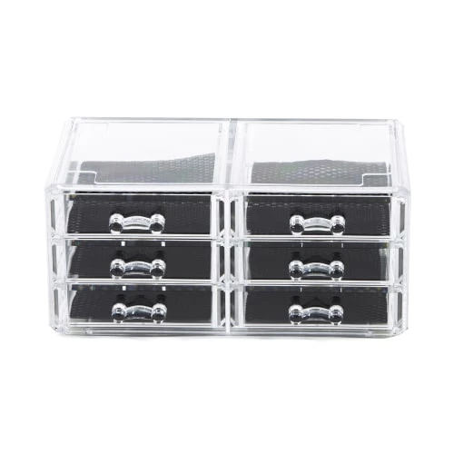 Rangement transparent pour bijoux et maquillage 6 tiroirs pour tout organiser Grâce à ce rangement transparentpour bijoux et cosmétiques, vous visualiserez facilement ce dont vous avez besoin. Dans votre chambre ou dans la salle de bain, plus besoin de chercher au fond des tiroirs, vos bijoux et produits de beauté préférés seront là sous vos yeux, parfaitement organisés et protégés de la poussière. Conçu comme une minicommode, ce range-bijoux est équipé de 6 tiroirs qui permettent de ranger ses affaires par style ou par couleur. C’est joli et très pratique pour retrouver facilement la paire de boucles d’oreilles ou le rouge à lèvres dont on a besoin. Pour protéger vos bijoux, chaque petittiroir est muni d’un tissu noir qui amortit les chocs. Rien ne vous empêche aussi d’utiliser cette mini commode pour ranger vos petites fournitures de bureau.Dimensions 23,8 X 15 X H.11 cm. Si vous aimez le maquillage et les bijoux, pourquoi ne pas vous aménager un espace beauté rien que pour vous ? Sur une étagère, une commode ou une console, dans une pièce bien éclairée,disposez plusieurs rangements transparents dans différents formats adaptés à ce que vous voulez ranger. Ce n’est pas le choix des organisateurs de beautéqui manque chez Compactor ! Regroupez-là tous vos accessoires. Bijoux bien sûr mais aussi poudre, fond de teint, rouges à lèvres, mascaraset tout le nécessaire pour les appliquer : les cotons à démaquiller, lesbrosses, les crayons,lespinceaux, le recourbe-cils… Bref, tout ce qu’il faut pour une petite retouche ou une vraie mise enbeauté ! Une maison accueillante où il fait bon vivre, c’est aussi celle qu’on aura mis tout son cœur à organiser. Avec des rangements adaptés, simples à installer et facilement accessibles, Compactor, entreprise familiale française au service de vos rangements depuis LIVRAISON GRATUITE à partir de 60€