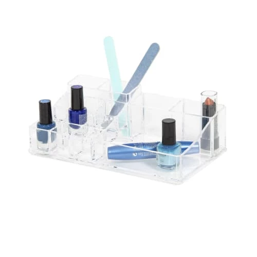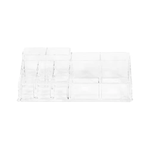Rangement transparent pour bijoux et maquillage 14 compartiments Ce présentoir permet de regrouper bijoux et produits de beauté pour les garder à portée de main et les retrouver facilement. Installez-lesur une commode dans votre chambre ou sur une étagère dans la salle de bain et vous gagnerez du temps au moment de vous préparer. Réalisé en polystyrène transparent, ce présentoir offre 14 compartiments et espaces de rangement de dimensions différentes pour le maquillage, les produits de beauté ou les bijoux. Dimensions : 22,3 X 12,7 X H.7cm. Si vous aimez le maquillage et les bijoux, pourquoi ne pas vous aménager un espace beauté rien que pour vous ? Sur une étagère, une commode ou une console, dans une pièce bien éclairée,disposez plusieurs rangements transparents dans différents formats adaptés à ce que vous voulez ranger. Ce n’est pas le choix des organisateurs de beautéqui manque chez Compactor ! Regroupez-là tous vos accessoires. Bijoux bien sûr mais aussi poudre, fond de teint, rouges à lèvres, mascaraset tout le nécessaire pour les appliquer : les cotons et cotons-tiges,les brosses, les crayons,lespinceaux, le recourbe-cils… Bref, tout ce qu’il faut pour une petite retouche ou une vraie mise enbeauté ! Une maison accueillante où il fait bon vivre, c’est aussi celle qu’on aura mis tout son cœur à organiser.Avec des rangements adaptés, simples à installer et facilement accessibles, Compactor vous aide à faire la chasse au désordre pour vous éviter dustress tout envous aidantàlibérer du temps pour vous.Et c’est fou comme, tout à coup, la maison bien ordonnéepeut sembler belle et facile à vivre! LIVRAISON GRATUITE à partir de 60€