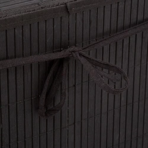 Ce joli panier à linge en bambou possède un sac en tissu noir et des poignées pour le transporter.