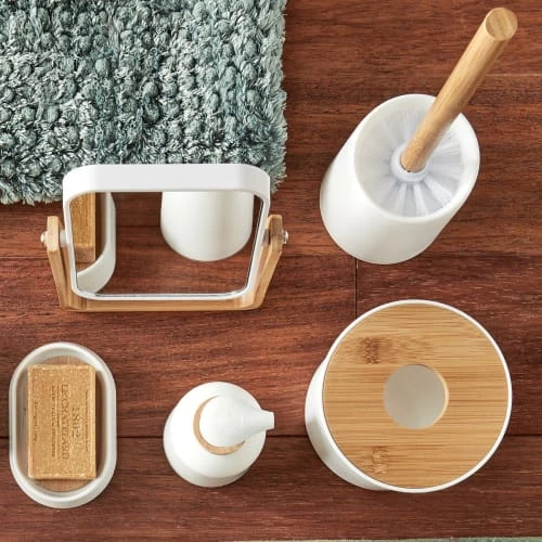 Cette gamme est conçue pour transformer vos accessoires de salle de bains en objet de décoration. Ce set de pot et brosse WC est conçu en polypropylène avec son détail en bambou.