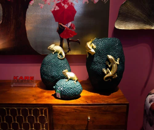 Ajoutez un air tropical à votre intérieur avec ce caméléon doré perché sur un fruit vert texturé. Ce petit gardien veillera sur vos bijoux et autres trésors. Cette boîte n’est pas conçue pour contenir de la nourriture.