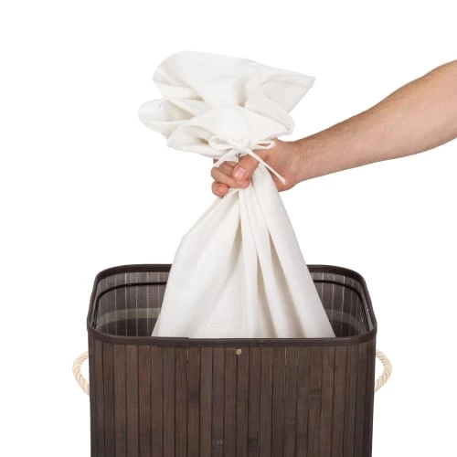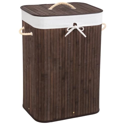 Panier à Linge, Corbeille à Linge, Bac / Sac à Linge Sale Rectangulaire en Bambou TECTAKE. Ce magnifique panier à linge amène de l’ordre chez vous, fini les vêtements sales qui trainent au sol. Il peut également servir de rangement pour les jouets des enfants, les chaussures et autres objets. Notre panier à linge s’illustre par sa belle apparence et offre une grande contenance. Le sac à linge amovible est particulièrement pratique. Contenance : 72 Litres. Dimensions totales (LxlxH) : environ 42 cm x 31,5 cm x 60 cm. Poids : 1,75 kg. Matériaux : Bambou, Matière synthétique. Composition du textile : 60 % Polyester, 40 % Coton.