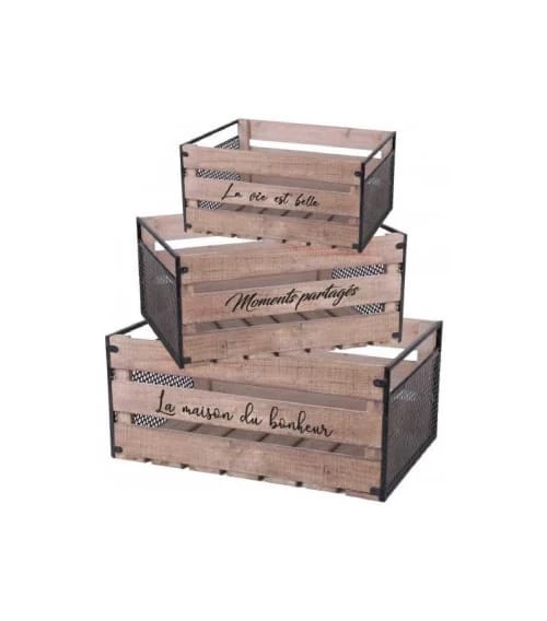 Set de 3 Caisses en bois et métal noir pour ranger toutes sortes d’objets de la maison, jouets, livres ou à disposer sur le plan de travail de la cuisine pour y ranger les légumes, fruits…