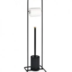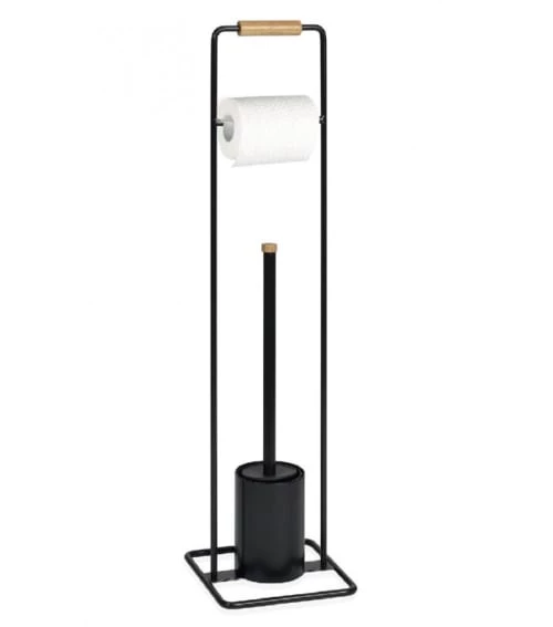 Dérouleur papier toilette et brosse wc en métal noir et en bois naturel. Un set pour WC compact, élégant et moderne. Matière: Métal et Bois – Couleur: Noir et Bois